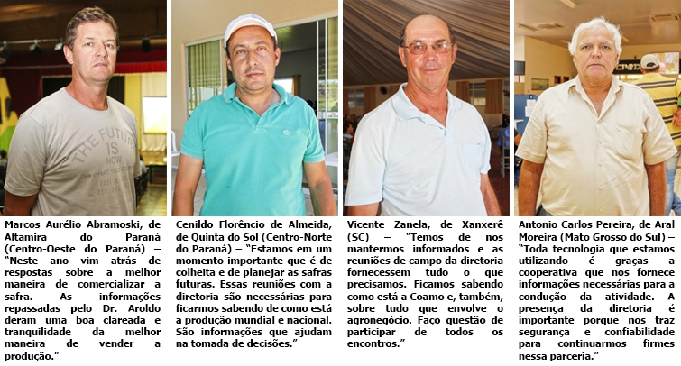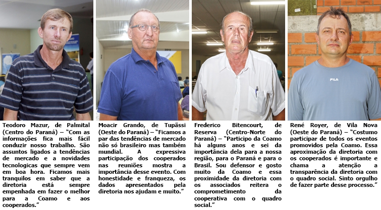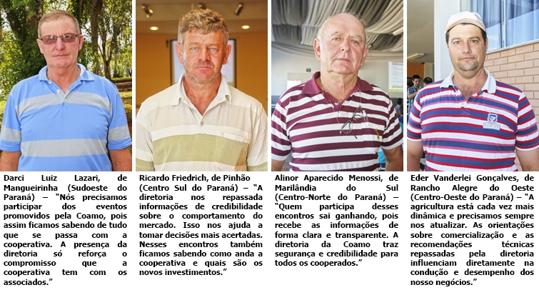 O presidente ressalta a satisfação de se encontrar com os cooperados duas vezes ao ano. “É importante porque nos aproximamos do quadro social. Levamos dados relevantes aos associados e também ouvimos importantes informações para que possamos planejar possíveis investimentos em toda área de ação da Coamo”, diz.