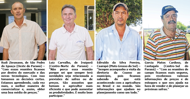 As tradicionais reuniões de campo da Coamo, neste primeiro semestre, foram realizadas de 22 de janeiro a 05 de fevereiro. Nesse período, a diretoria da cooperativa percorreu cerca de cinco mil quilômetros para levar informações ao quadro social. Foram realizados 38 encontros que contaram com a participação de mais de dez mil cooperados no Paraná, Santa Catarina e Mato Grosso do Sul.