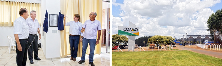 CONFIANÇA - Durante a cerimônia de inauguração, o cooperado número 01 da Coamo, Lourenço Tenório Cavalcanti descerrou a placa da inauguração ao lado de Gallassini e autoridades. Tenório foi um dos 79 agricultores à assinar a ata de fundação da Coamo em 28 de novembro de 1970. Há mais de 30 anos ele está produzindo em Maracaju. Com a chegada da Coamo em sua região, ele não pensou duas vezes e voltou a movimentar com a cooperativa. “É uma beleza o cooperativismo, é muito bom trabalhar e ter a Coamo por perto”, comemora.