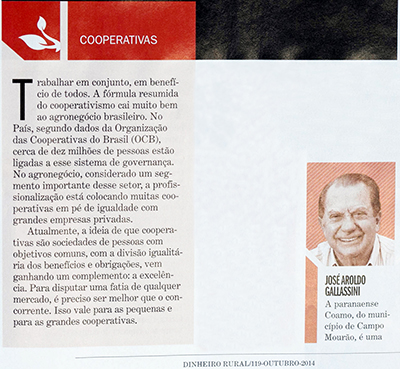 Iniciando a celebração dos dez anos da revista Dinheiro Rural, a Editora Três publica a edição nº 119 (Outubro/2014), apontando as 100 personalidades mais influentes do agronegócio brasileiro. Entre estas está o engenheiro agrônomo José Aroldo Gallassini, presidente da Coamo, destacado no segmento Cooperativas, que traz também Márcio Lopes de Freitas, presidente da Organização das Cooperativas Brasileiras (OCB).