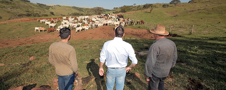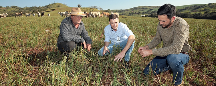 | João Barcarol, Willian Sehaber e o médico veterinário Fabiano Camargo. Sistema possibilita integrar a produção de grãos e criação de gado numa mesma área |