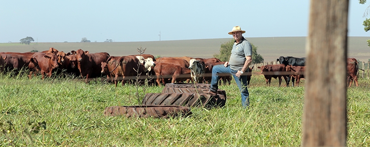 Na propriedade do cooperado Antonio Irineu Trentin, em Itaporã (Mato Grosso do Sul), a integração lavoura-pecuária foi implantada há cerca de três anos e surgiu pela necessidade de uma nova opção de renda e melhoria no sistema de produção. A área fica na região do Carumbé e soma 160 hectares de plantio de lavoura e 36 de pasto perene. Com a integração são criados cerca de 105 cabeças de gado da raça senepol. O cooperado está no Mato Grosso do Sul há 15 anos. Antes ele residia em Val Paraíso (SP), onde trabalhava com gado de leite.