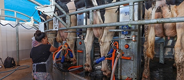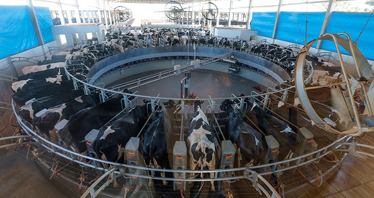 | As 820 vacas levam em torno de três horas e meia para serem ordenhadas |