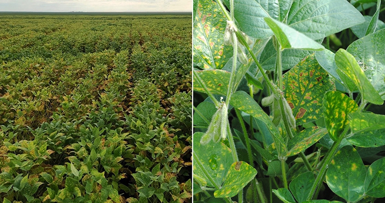 | Lavoura de soja com reboleiras causadas por nematoide e sintomas de folha carijó |