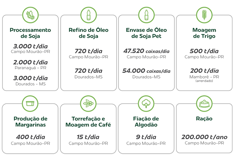 O complexo de processamento de soja em Dourados é composto por duas indústrias. Uma estrutura de esmagamento da oleaginosa, responsável pela produção do farelo de soja, fonte de proteína para nutrição animal; casca de soja, fonte de fibra para nutrição animal; e o óleo bruto, que também pode ser utilizado para a composição de rações, biodiesel, entre outros produtos. Outra indústria é a refinaria de óleo, que refina o óleo bruto e o transforma em produto alimentício para consumo humano.