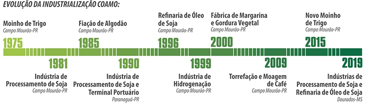 A Coamo foi fundada em 1970 e a agroindustrialização começou em 1975 com a implantação do moinho de trigo. Seis anos mais tarde, em 1981, entrou em funcionamento a primeira indústria de processamento de óleo de soja. Na sequência vieram em 1985, a fiação de algodão, 1990 a indústria de processamento de soja e Terminal Portuário em Paranaguá, 1996 refinaria de óleo de soja, 1999 indústria de hidrogenação, 2000 fábrica de margarina e gordura vegetal, 2009 torrefação e moagem de café e 2015 novo moinho de trigo. Em novembro de 2019, a cooperativa inaugurou em Dourados (MS), duas novas indústrias para produção de processamento de óleo de soja e refinaria de óleo de soja.