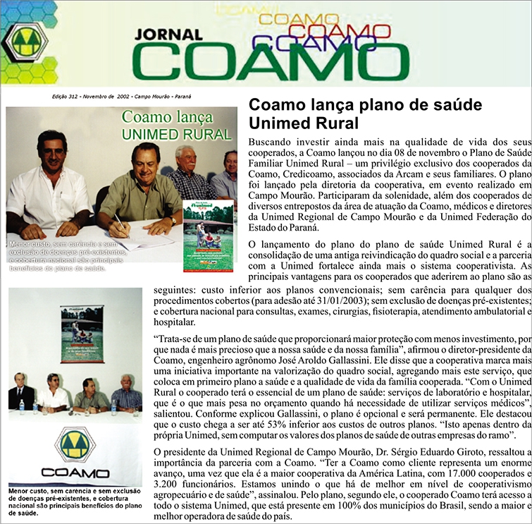 A qualidade de vida dos cooperados sempre esteve entre as premissas da Coamo. Diante disso, em 08 de novembro de 2002, a cooperativa lançou o Plano de Saúde Familiar Unimed Rural, um privilégio exclusivo dos associados da Coamo, Credicoamo e seus familiares. Além de ser um benefício, foi um marco cooperativista. “Estamos falando da confiança estabelecida entre o maior sistema cooperativo médico do mundo, o Sistema Unimed, por meio da singular de Campo Mourão, e da maior cooperativa agroindustrial da América Latina, com importância mundial no setor de produção agrícola, a Coamo”, afirma o presidente da Unimed Campo Mourão, Rodolfo Cesar Visoni Poliseli.