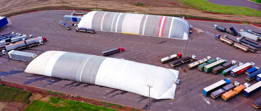 | Silos infláveis estão sendo utilizados para armazenar produção de soja dos cooperados. Estrutura está sendo montada em unidades do Paraná e Mato Grosso do Sul |