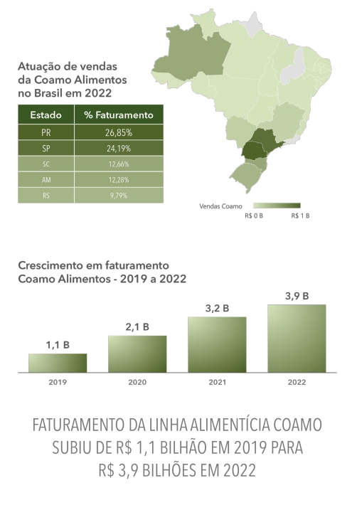 A atuação de vendas da linha alimentícia da Coamo se destaca em cinco Estados brasileiros: Paraná (26,85%), São Paulo (24,19%), Santa Catarina (12,66%), Amazonas (12,28%) e Rio Grande do Sul (9,79%). O time de representantes tem a missão de levar a linha alimentícia Coamo, originada nos campos dos mais de 30 mil cooperados, à mesa de milhões de brasileiros.