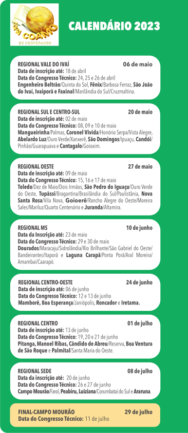 Os jogos serão aos sábados e seguirá até 08 de julho com a Regional Sede. A final e o cerimonial, que sempre é uma atração surpresa, será dia 29 de julho na Arcam, em Campo Mourão.
