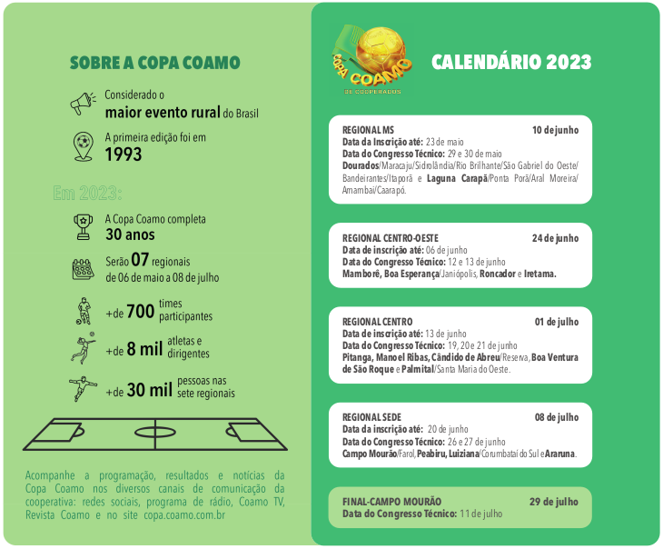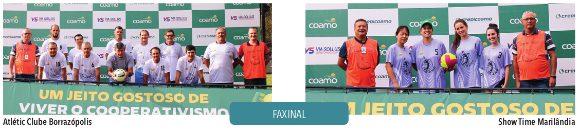 “Os cooperados são bons no campo da produção e, também, no futebol. Os números consolidam toda uma alegria com elevado espírito esportivo, orgulho e entusiasmo de todos. Um evento que valoriza o esporte e lazer, preparado e organizado com muito empenho, qualidade e dedicação pelos funcionários da cooperativa. Eles são voluntários em prol do lazer, entretenimento e satisfação da família cooperada”, comenta José Aroldo Gallassini, presidente dos Conselhos de Administração da Coamo e Credicoamo.