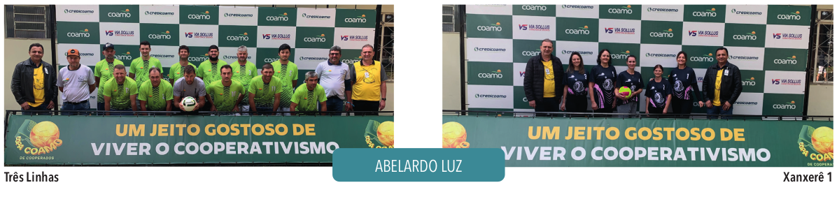 Barsemlona e Inter de Meião. Os nomes bem sugestivos dos times são alguns exemplos da criatividade e do bom humor dos cooperados que participam da Copa Coamo. As duas equipes formadas por cooperados de Xanxerê participaram, em Abelardo Luz (Oeste de Santa Catarina), da regional Sul e Centro-Sul, realizada no dia 20 de maio. E esse é o espírito de quem participa do evento, com muita descontração e mostrando que o mais importante é a participação.