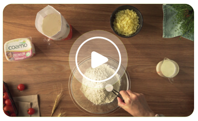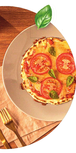 Coloque o trigo e o sal em uma tigela e misture. Junte a margarina e despeje o leite morno. Misture a massa com as pontas dos dedos até incorporar. Sove rapidamente a massa, dentro da tigela. Divida a massa em quatro pedaços iguais. Abra a massa sobre uma frigideira antiaderente, com os dedos, do centro para as bordas, até ocupar todo o fundo da frigideira. Leve ao fogo baixo por 4 minutos. Vire a massa e monte a pizza nesta ordem: molho, queijo e tomate em rodelas. Asse por mais 4 minutos. Sirva no prato e finalize com as folhas de manjericão.