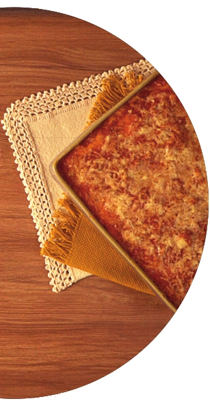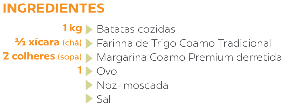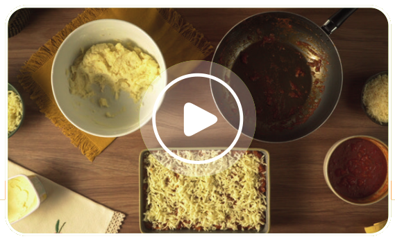 Amasse as batatas para obter um purê. Tempere com sal e noz-moscada. Junte o ovo e a margarina derretida e misture bem. Junte o trigo e mexa até incorporar. Reserve. Para o recheio: derreta a margarina em uma frigideira funda. Junte a carne e tempere com sal e pimenta. Doure a carne, mexendo para esfarelar os grumos que se formam. Quando estiver bem dourada, junte duas xícaras de molho de tomate e deixe ferver para reduzir o líquido. O preparo deve ficar úmido, porém sem molho. Unte uma travessa refratária com margarina e coloque metade da massa de nhoque. Distribua o recheio de carne moída sobre a massa e polvilhe o queijo muçarela. Cubra com o restante da massa. Espalhe o molho de tomate restante e polvilhe o queijo parmesão. Leve ao forno preaquecido a 200 ºC por 20 minutos, até que a superfície esteja gratinada.