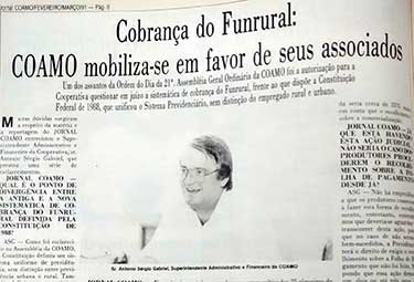 Mar/91: Na 21ª Assembleia Geral Ordinária: “Cobrança do Funrural: Coamo mobiliza-se em favor de seus associados ”, sobre a autorização para a Coamo questionar em juízo a sistemática de cobrança do Funrural, frente ao que dispõe a Constituição Federal de 1988, que unificou o Sistema Previdenciário, sem distinção do empregado rural e urbano.