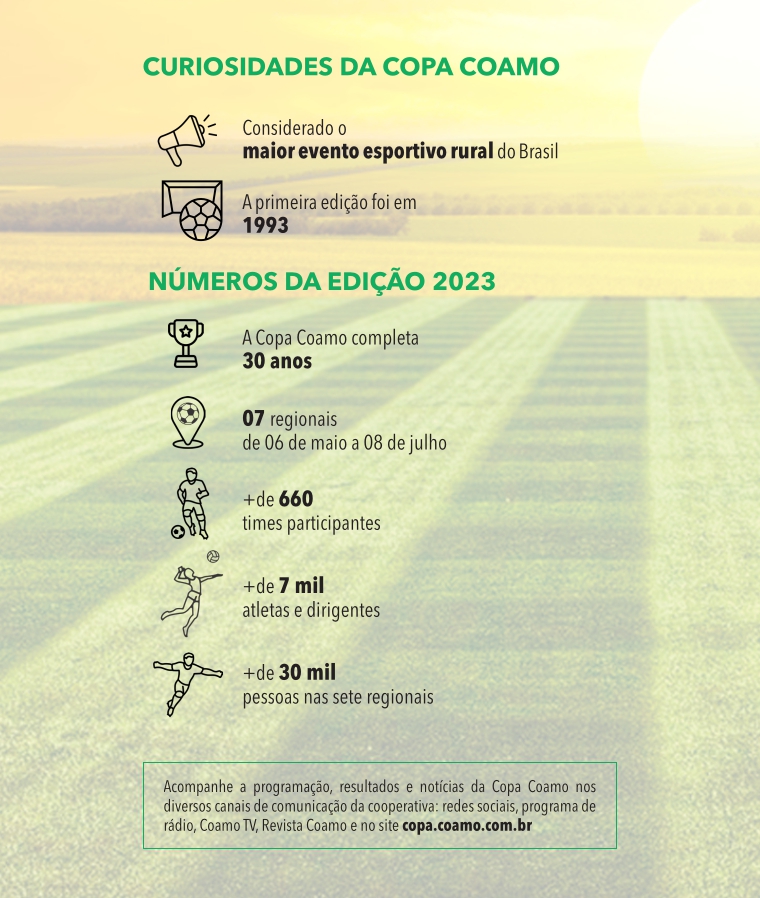 A Copa Coamo começou no dia 06 de maio, marcando o início de uma jornada repleta de esporte e confraternização. Foram sete regionais, reunindo cerca de 660 equipes e mais de sete mil atletas dentro de campo, com o futebol suíço, e nas quadras com o vôlei de areia feminino. Do total de equipes, 33 se classificaram para a final, realizada no dia 29 de julho, em Campo Mourão.