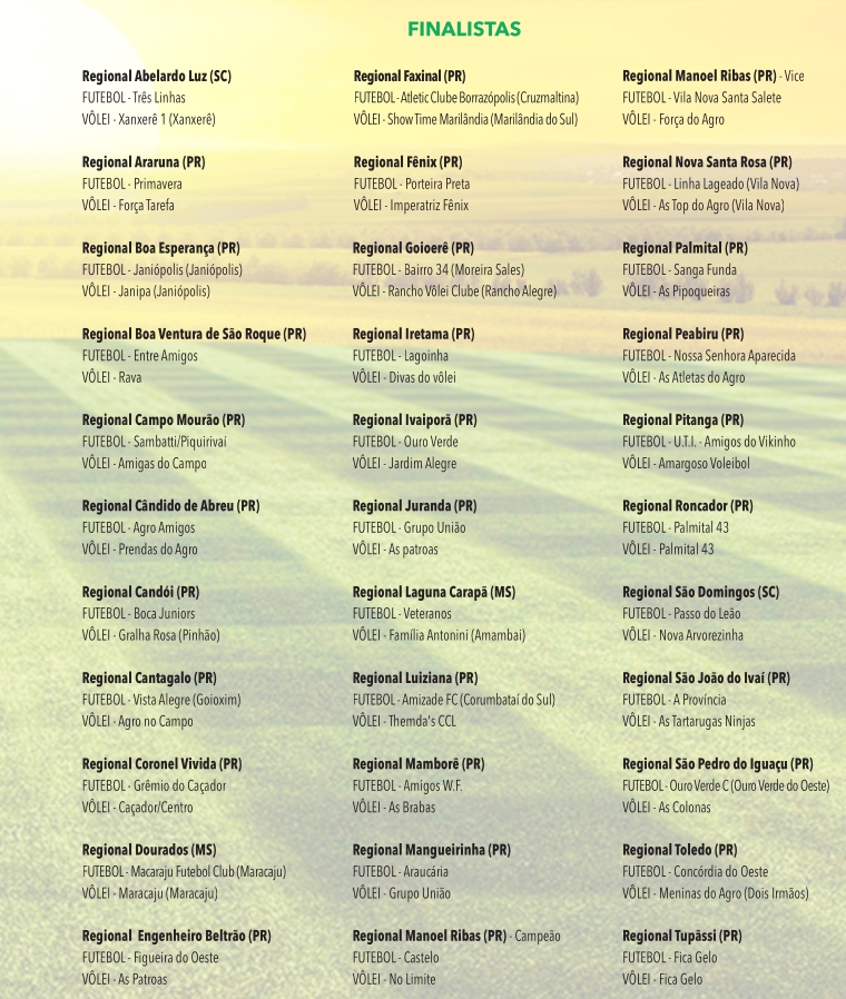 Com muita integração, alegria e presença das famílias, a Regional Sede da Copa Coamo 2023, realizada em Araruna, Campo Mourão, Luiziana e Peabiru, no dia 08 de julho, foi um grande sucesso. Essa etapa foi a última classificatória antes da gran- de final, agendada para o dia 29 de julho, na Arcam em Campo Mourão.