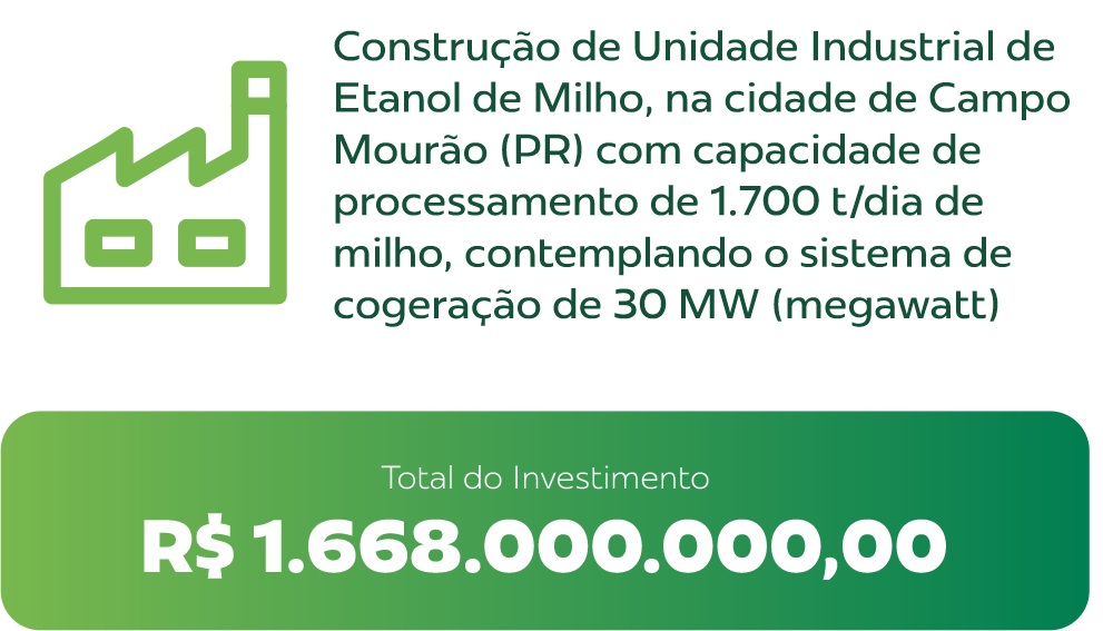 Do volume total aprovado na AGE, o valor de R$ 1,67 bilhão será destinado a construção de uma unidade industrial de etanol de milho, em Campo Mourão com capacidade de processamento de 1.700 t/dia de milho, contemplando o sistema de cogeração de 30 MW (Megawatt). “Com o milho contemplamos toda a cadeira produtiva de produtos recebidos pela Coamo. A indústria de etanol de milho é um sonho antigo. Fizemos vários estudos de viabilidade para verticalizar a produção do milho, sempre pensando em remunerar melhor os cooperados. De forma segura, temos certeza de que este é o momento certo para implantar esta nova fábrica que terá novos produtos como os de combustíveis renovados e de farelo de milho. Iremos consumir 20% de todo o milho recebido pela cooperativa”, diz o presidente Executivo da Coamo.