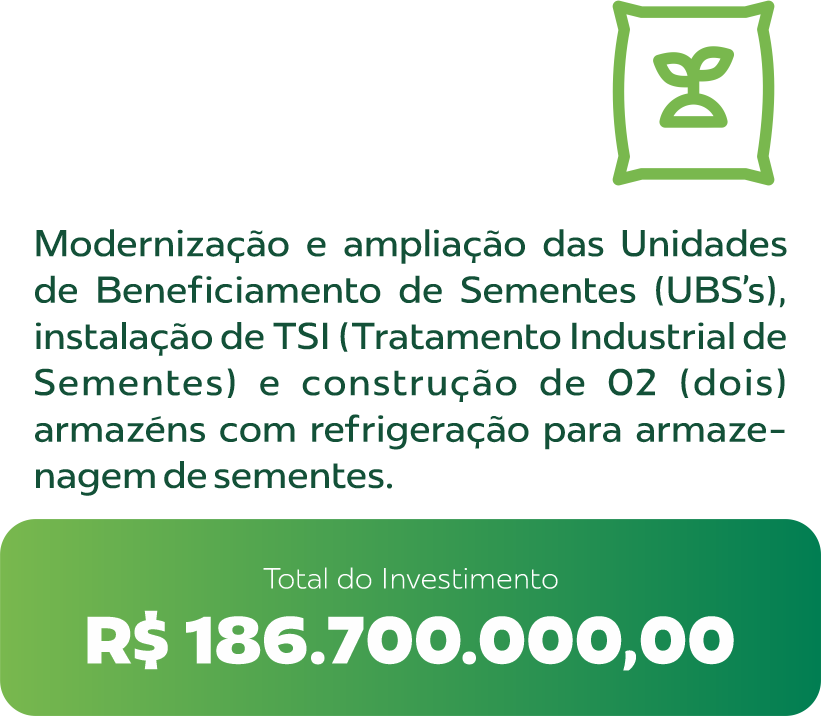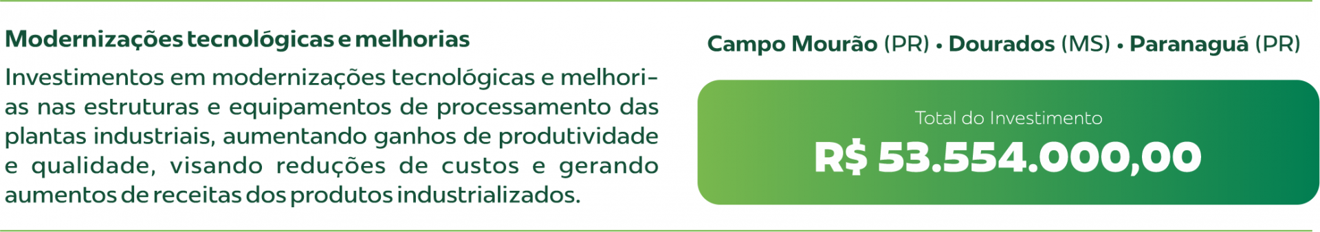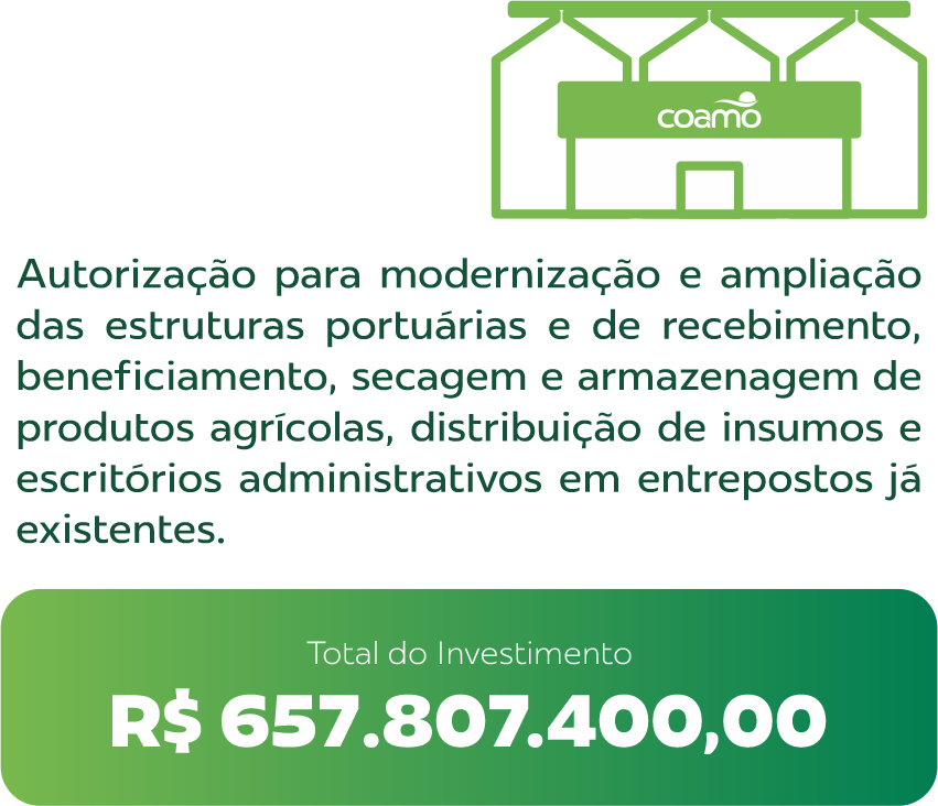 Os cooperados aprovaram investimentos a serem realizados em 80 unidades nos três Estados da área de ação da Coamo com modernização e ampliação das suas estruturas portuárias e de recebimento, beneficiamento, secagem, armazenagem de produtos agrícolas, distribuição de insumos, produção de sementes e de escritórios administrativos.