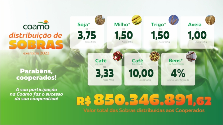 Cada cooperado recebe na proporção da sua movimentação com a cooperativa. Estão sendo devolvidos: R$ 3,75 para cada saca de soja entregue na Coamo, R$ 1,50 para o milho, R$ 1,50 para o trigo, R$ 1 para a aveia, R$ 3,33 para o café em coco, R$ 10 para o café beneficiado e 4% para os insumos adquiridos na cooperativa durante o exercício de 2023.