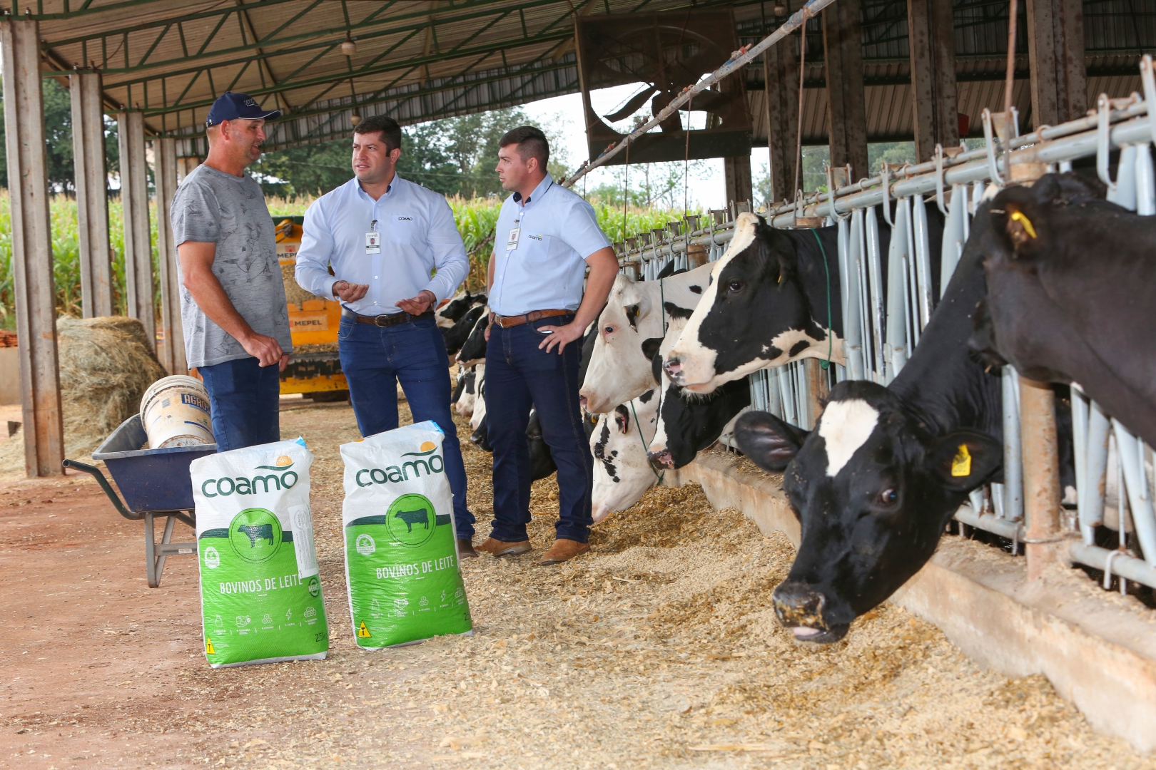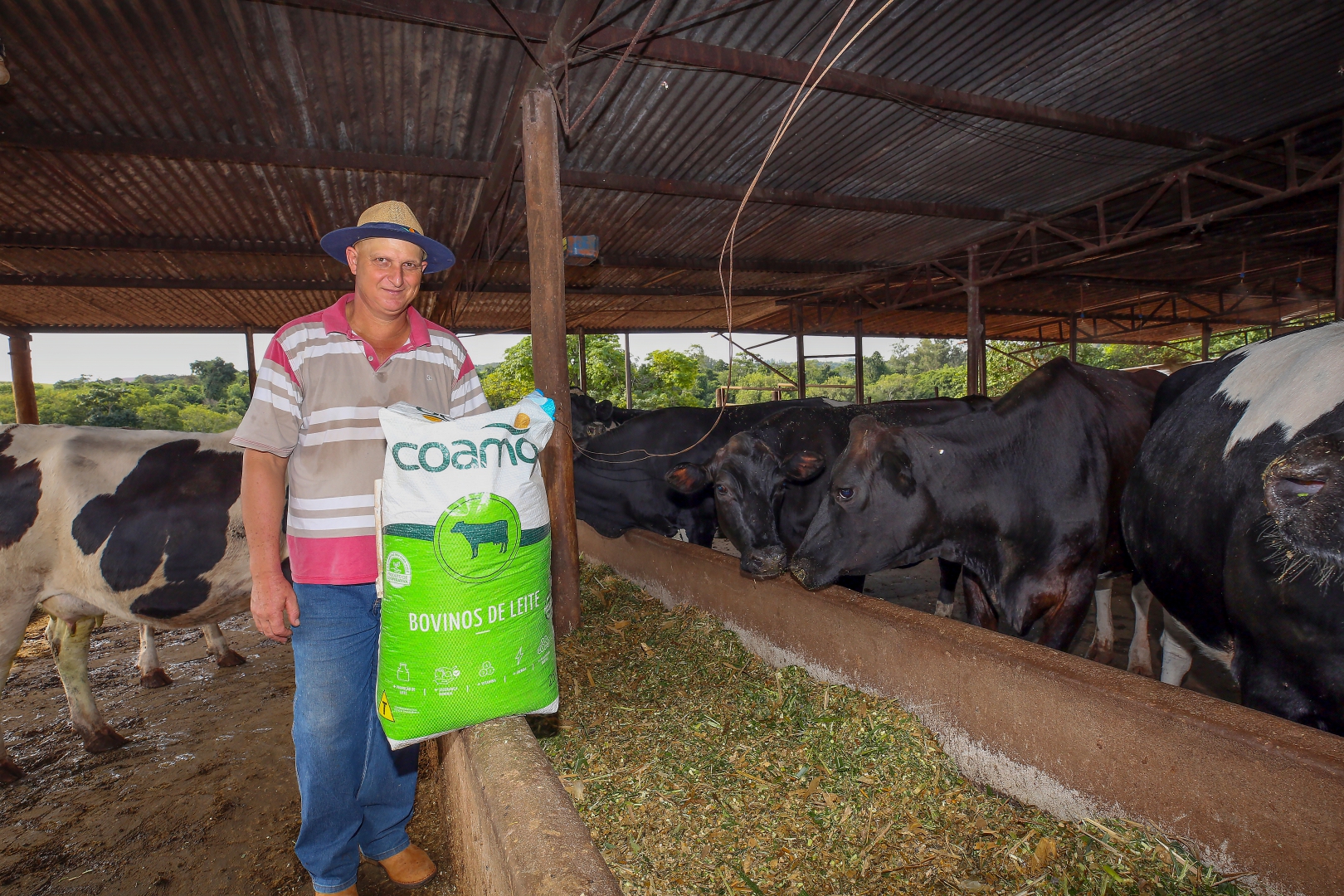 As vacas são ordenhadas duas vezes por dia e recebem ração de lactação no cocho. Após a ordenha, elas ficam abrigadas em pastos divididos em piquetes. “As Rações Coamo foram muito bem aceitas pelos animais, que aumentaram a produtividade entre 20% e 30%. A ração se destaca por ser palatável e cheirosa, diferentemente de outros produtos que os animais rejeitavam devido ao cheiro forte”, comenta.