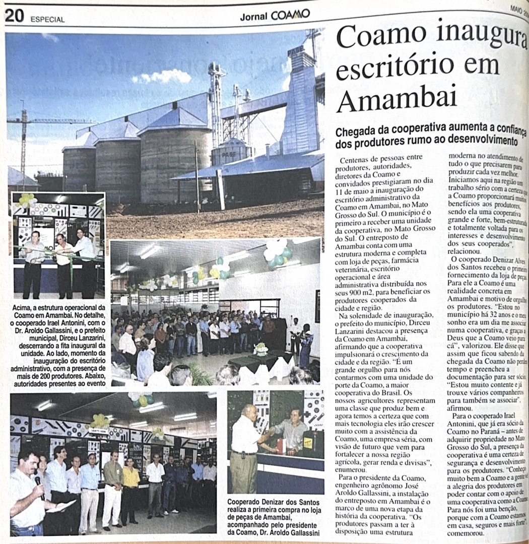José Aroldo Gallassini, presidente dos Conselhos de Administração da Coamo e Credicoamo, explica motivos que levaram a cooperativa a se estabelecer na região. "Quando, juntamente com a diretoria, resolvemos expandir as atividades da Coamo para o Mato Grosso do Sul, avaliamos diversos fatores. Muitos produtores associados da Coamo no Paraná e Santa Catarina já estavam no Estado. Além das reivindicações dos produtores, diversas autoridades locais pediram à Coamo que desenvolvesse o cooperativismo no Mato Grosso do Sul, replicando o sucesso dos modelos praticados no Paraná e Santa Catarina”, comenta.