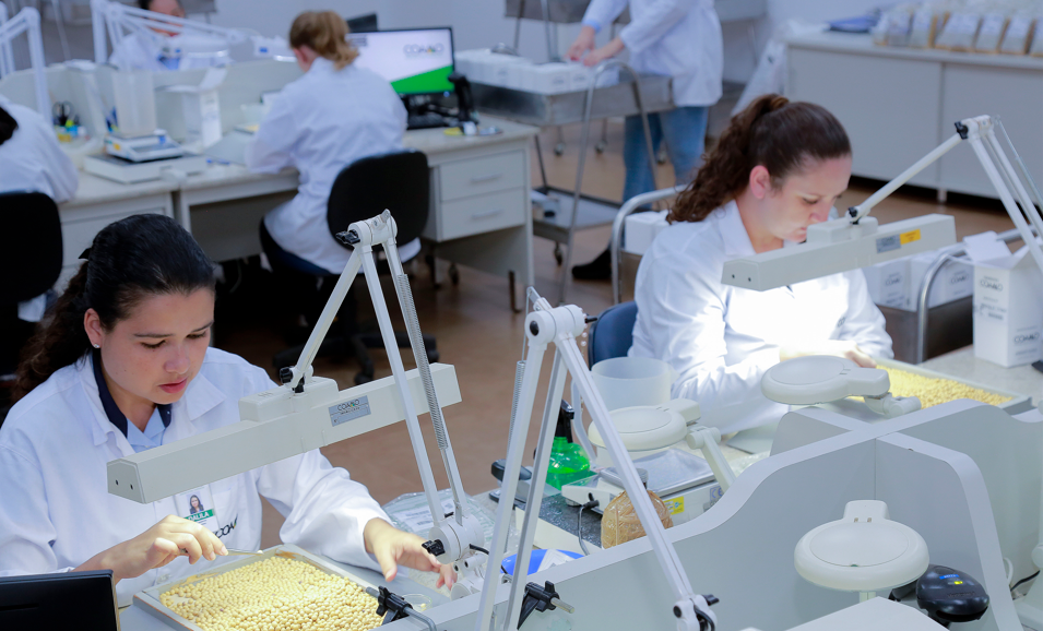 O Laboratório de Análise de Sementes da Coamo conta com uma equipe altamente qualifi cada, composta por analistas de sementes, auxiliares laboratoristas e uma equipe técnica com engenheiros agrônomos e assistentes de qualidade, que vistoriam os campos e coletam amostras para os testes laboratoriais.