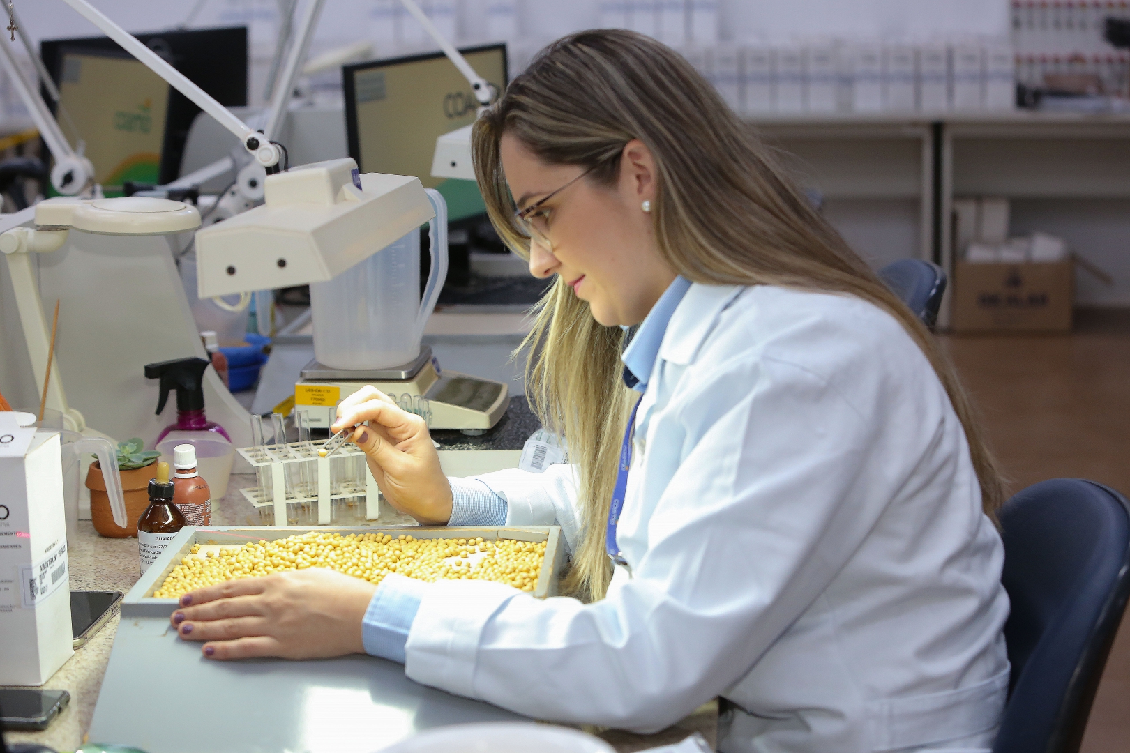 O processo de controle de qualidade das sementes começa na fase de pré-colheita, com equipes técnicas vistoriando os campos, coletando amostras e enviando ao laboratório para testes, como o de tetrazólio. Durante o recebimento das sementes, "o laboratório valida o trabalho dos classifi cadores e garante a qualidade antes do benefi ciamento". Esse controle inclui testes de pureza, germinação e vigor.