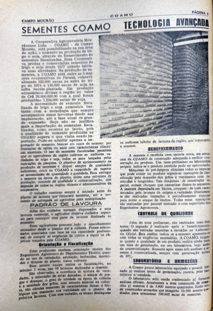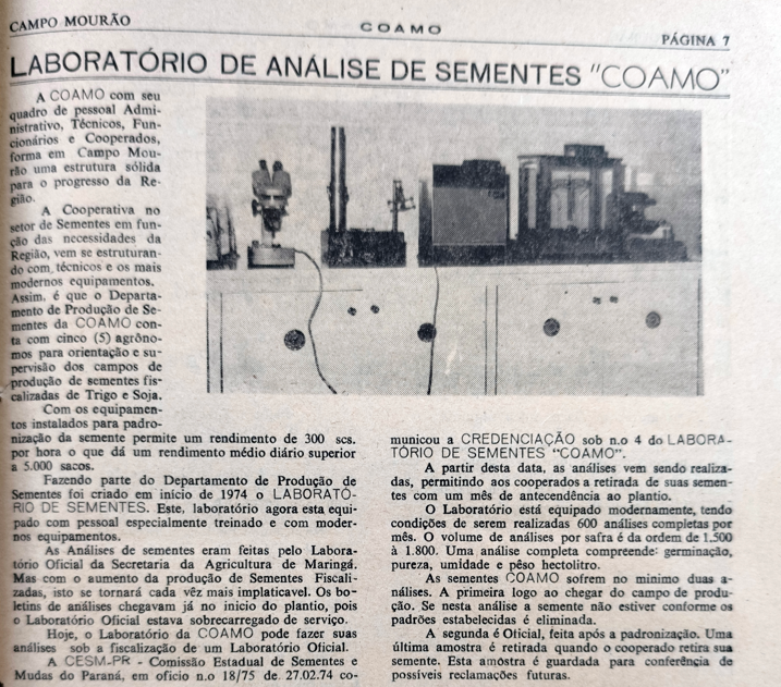 No início, a Coamo focava em atender as necessidades dos cooperados, que eram poucos. As sementes, principalmente de soja e trigo, eram adquiridas de outros estados, especialmente do Rio Grande do Sul. Entre 1972 e 1974, o volume necessário de sementes aumentou signifi cativamente devido à expansão das áreas de plantio na região. Para atender à demanda, a Coamo iniciou a produção de sementes próprias, e as análises eram feitas em Maringá, na regional da Secretaria de Agricultura. Contudo, os resultados demoravam a chegar, o que levou à construção do Laboratório de Análise de Sementes da Coamo.