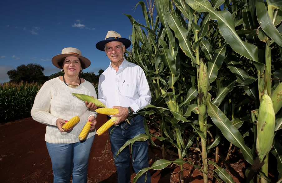 Antonio César Diniz com a esposa Sônia Maria Tittoto Diniz mostram o milho segunda safra com bom desenvolvimento mesmo após longo período sem chuva na área