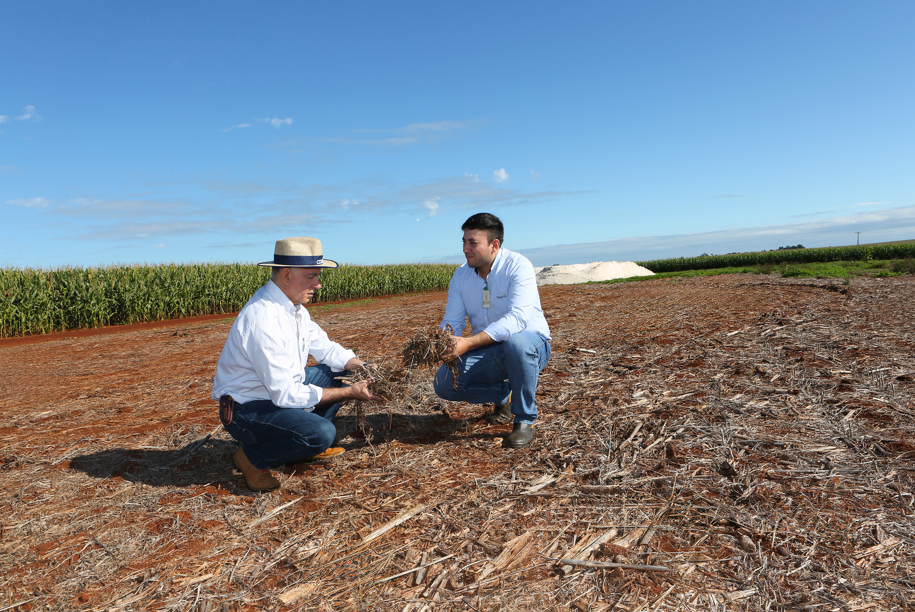 Antonio César Diniz analisa palhada com o engenheiro agrônomo da Coamo, Iury Machry Bomfi m. Área será ocupada com trigo no inverno dentro de um planejamento de rotação de culturas