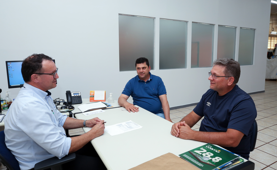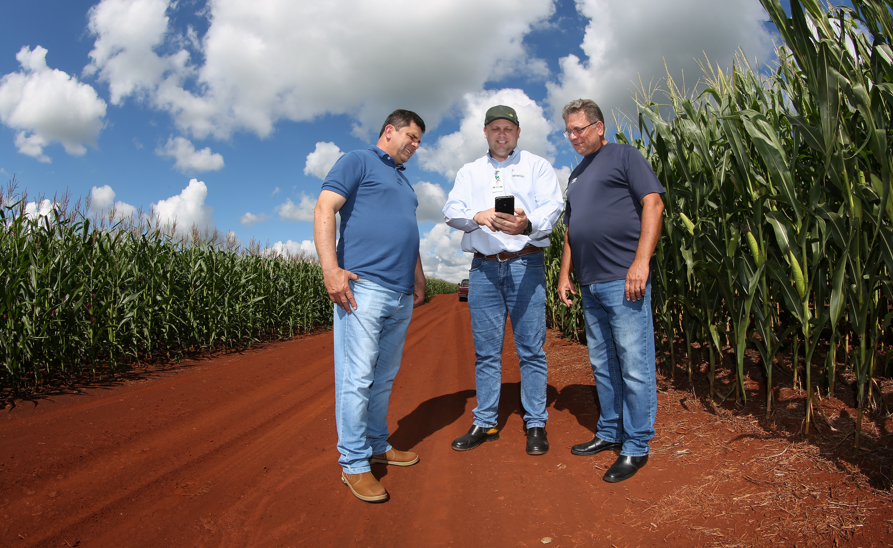 Sérgio Bertolla, gerente da Coamo em Juranda (PR), com o cooperados João Maria e Márcio Leandro de Carvalho. Parceria e planejamento das lavouras