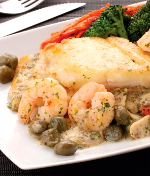 Certifique-se de que o peixe esteja sem espinhos. Caso ele ainda esteja com espinhos, retire-os com uma pinça, tempere os filés com sal e pimenta, em seguida empane-os com FARINHA DE TRIGO COAMO. Doure-os em uma frigideira com MARGARINA COAMO EXTRA CREMOSA. Utilizando a mesma panela com o fundo que ficou do peixe, adicione um fio de ÓLEO DE SOJA COAMO, derreta 225 g de MARGARINA COAMO EXTRA CREMOSA e adicione os cogumelos, o vinho, as alcaparras, o suco de limão e refogue por 5 minutos. Adicione os camarões já temperados com sal e pimenta, deixe-os ferver por 30 segundos. Para finalizar, despeje esse molho sobre os filés dourados, adicione a salsinha e sirva. Este prato acompanha muito bem batatas e legumes salteados na margarina ou arroz branco.