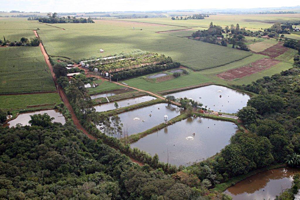 Vista aérea da propriedade que conta com agricultura, suinocultura, fabricação de artefatos de cimento e cinco tanques para a criação de peixes |