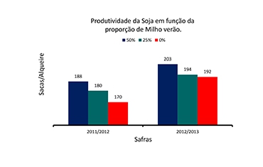 As colunas em azul representam produtividades de uma propriedade que em todas as safras, metade da área é com milho verão e a outra metade é com soja, sendo que as lavouras são alternadas de área ano a ano. Em verde, área com apenas 25% com milho verão e 75% com soja e, finalmente, em vermelho área onde nunca se planta milho verão, ou seja, sem rotação de culturas. O |
