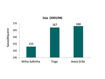O gráfico demonstra a necessidade de diversificar as culturas de inverno visando melhorar a produtividade da soja cultivada na sequência. Observa-se que a sucessão de culturas todos os anos com milho safrinha e soja representa a pior alternativa para a soja, quando comparada a áreas que utilizaram a cultura do trigo ou aveia em rotação de culturas. |