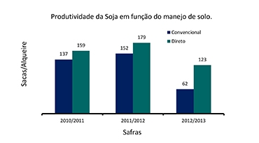 As colunas em azul representam uma propriedade que não faz o plantio direto e em verde a que adota o sistema. Na média das três safras as áreas em plantio direto apresentaram produtividade 31% maior. |