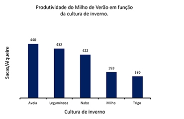 O gráfico demonstra, mais uma vez, a importância do produtor diversificar as lavouras no inverno. Observa-se que o milho verão após as alternativas de inverno apresenta produtividade variável, o que requer cuidado e atenção com o manejo, especialmente, quando este milho verão é plantado todos os anos após o milho safrinha e trigo isoladamente. |