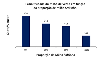 O gráfico demonstra que a medida que o produtor reduz a área de milho safrinha, aumenta-se a produtividade de milho verão plantado na sequência. |