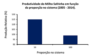 Este resultado de nove anos de trabalho comprova que o produtor que semeia toda a área com milho safrinha tem a produtividade reduzida em 15% quando comparado ao plantio em apenas metade da área. A medida que se reduz a área de milho safrinha aumenta-se a produtividade. |