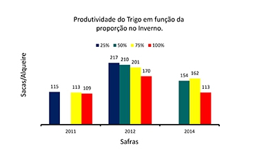 As colunas em azul representam a produtividade de uma propriedade em que todas as safras o produtor planta apenas 25% da área com trigo. Em verde, 50% da área, em amarelo 75% e em vermelho 100% da área, ou seja, não se faz rotação de culturas. |