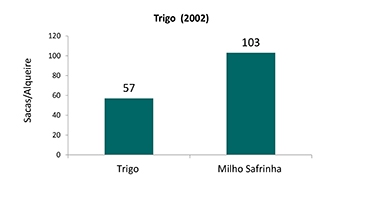O gráfico mostra que a produtividade de trigo numa área em que se repete o plantio num mesmo talhão todos os anos, é aproximadamente 50% inferior ao talhão onde se faz a rotação de culturas, alternando-o com milho safrinha. |