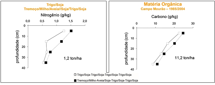 Os gráficos mostram que num período de nove anos de estudos, uma área manejada com rotação de culturas promove aumento significativo de carbono e nitrogênio no solo. Essa melhoria ocorre em todo o perfil de solo, mesmo a 40 centímetros de profundidade, quando comparado a uma área sem rotação de culturas.