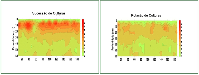 Os gráficos mostram o efeito da rotação de culturas sobre a resistência do solo à penetração das raízes. Observa-se no quadro à esquerda, a camada de adensamento do solo que se forma nos primeiros 20 centímetros de profundidade em uma área manejada sem rotação de culturas. Por outro lado, quando o solo é manejado com rotação de culturas esse efeito não é observado como demonstrado no quadro à direita.