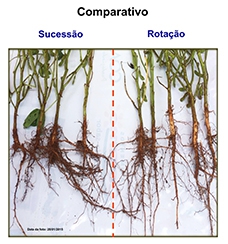 A imagem revela a qualidade de raízes nas plantas com rotação de culturas (direita), onde são mais desenvolvidas e com arquitetura vertical, atingindo maior profundidade no solo, que permite maior absorção de água e nutrientes e promove mais rentabilidade e estabilidade em condições climáticas adversas. Do lado esquerdo, observa-se a dificuldade de penetração das raízes no solo e a orientação predominante no sentido horizontal (raízes superficiais, tortas e bifurcadas).