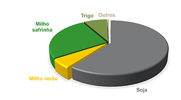 | A Coamo prevê receber nesta safra um total de 115,4 milhões de sacas de produtos, sendo 69,6 milhões de soja, 6,3 milhões de milho verão, 30 milhões de milho safrinha, 9 milhões de trigo e 500 mil sacas de outros produtos como café, aveia e triticale. |