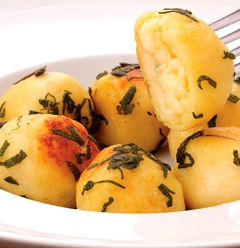 Outro segredo do nhoque é não sovar a massa. Quanto mais você trabalha com a massa, mais trigo será necessário para dar o ponto, resultando num nhoque pesado. Faça bolinhas médias, com uns 3 cm de diâmetro. Abra a massinha com a mão fazendo um disco, coloque queijo no centro e feche-as. Em uma panela grande, coloque água até a metade e tempere-a com sal. Adicione os nhoques (aos poucos sem lotar a panela). Conforme os nhoques começarem a subir, apanhe-os e os coloque em uma frigideira aquecida, já com Margarina Coamo Família e a Sálvia picada. Salteie-os e finalize colocando-os em uma travessa. Esta é uma opção muito boa para congelarmos também. Após o preparo, antes do cozimento, podemos congelar e ela terá uma validade de 20 dias.