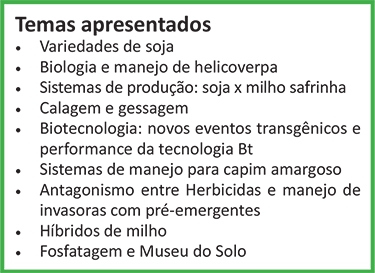 Neste ano o tema principal do encontro foi o Manejo Integrado de Tecnologias – MIT. A prática envolve o MIP – Manejo Integrado de Pragas, o MID – Manejo Integrado de Doenças, o MIPD – Manejo Integrado de Plantas Daninhas e Manejo Integrado de Solos. O engenheiro agrônomo Joaquim Mariano Costa explica que é preciso aliar todas essas ferramentas para a condução das atividades agrícolas.