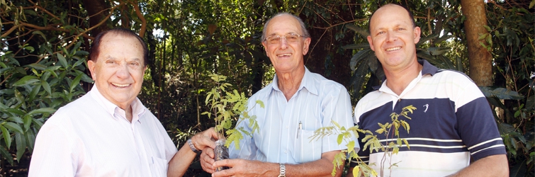 No final do encontro todos os cooperados receberam mudas de árvores nativas como a gorucaia, canafístula e aroeira. Na imagem, o diretor-presidente da Coamo, José Aroldo Gallassini faz a entrega aos cooperados João Marco e o filho Marcos Nicareta, de Pitanga (Centro do Paraná). No total foram distribuídas mais de dez mil mudas.