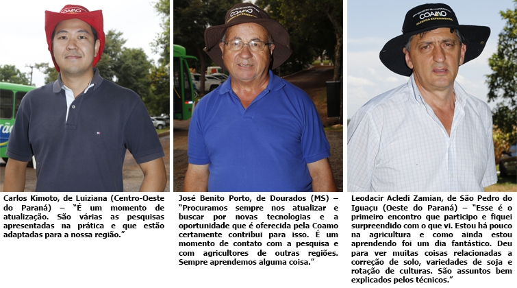 Durante o encontro de cooperados da Fazenda Experimental diversos pesquisadores marcam presença. Entra ano e sai ano, eles estão lá para levar conhecimento e, também, descobrir as necessidades do produtor rural. De acordo com o chefe-geral da Embrapa Soja, José Renato Bouças Farias, o encontro tem servido de exemplo pela difusão das tecnologias. “Há 20 ou 30 anos, o agronegócio brasileiro era pequeno. Com ações concretas, os produtores começaram a receber altas tecnologias e passaram a buscar soluções para os problemas que atormentavam o processo produtivo. O produtor foi crescendo e esse sucesso se deve à ações concretas como essa realizada pela Coamo.” Farias destaca que a agropecuária chegou a um nível em que todas as tecnologias devem ser integradas e a busca por soluções têm que acontecer como um todo. “O controle de um problema deve ser integrado para que uma ação não prejudique a outra. É fundamental para o produtor buscar informações, ter soluções para as atividades.”